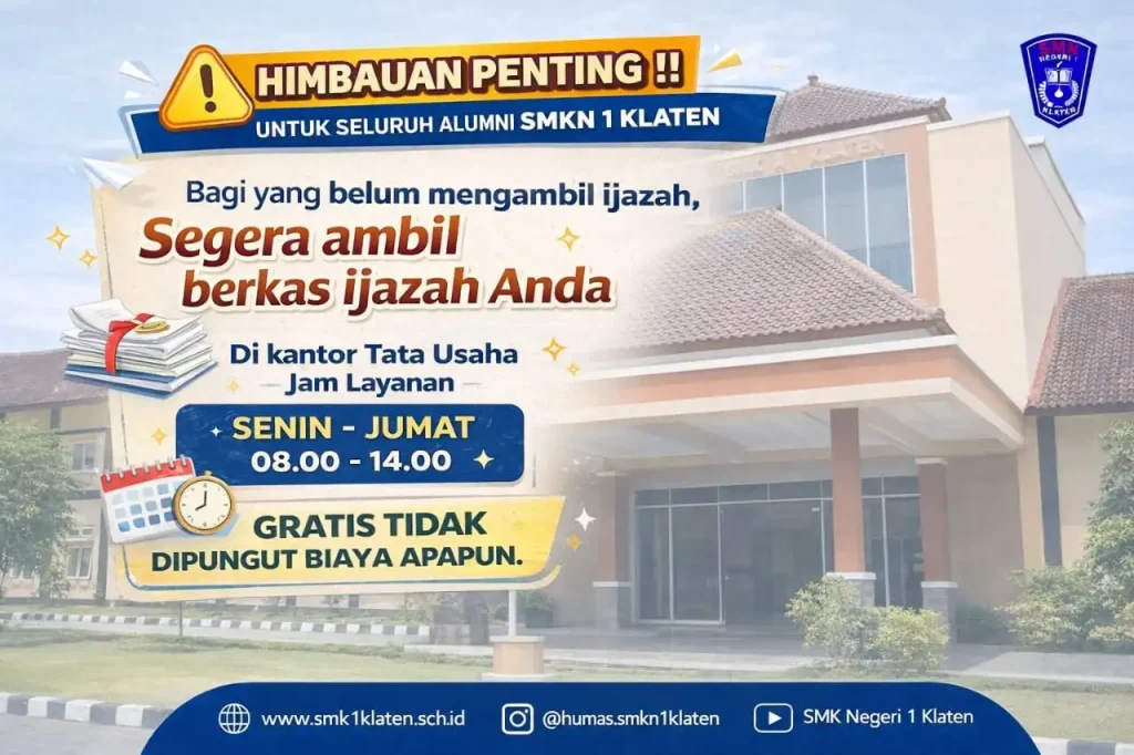 KLATEN, 6 Maret 2026 – Pihak Manajemen SMK Negeri 1 Klaten mengeluarkan imbauan penting bagi seluruh alumni dari berbagai angkatan yang hingga saat ini belum mengambil berkas ijazah asli di sekolah. Para alumni diharapkan segera mengurus pengambilan dokumen penting tersebut guna keperluan administrasi karier maupun studi lanjut.